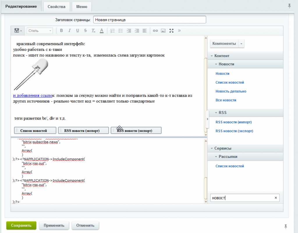 «1C-Битрикс: Управление сайтом — Стандарт» позволяет управлять информационным наполнением сайта: изменять меню, создавать новые разделы и страницы, редактировать тексты в онлайновом HTML-редакторе, размещать изображения, публиковать новости и многое другое.