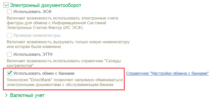 Установить флаг «Использовать обмен с банками» (Настройки – Параметры учета – Электронный документооборот)