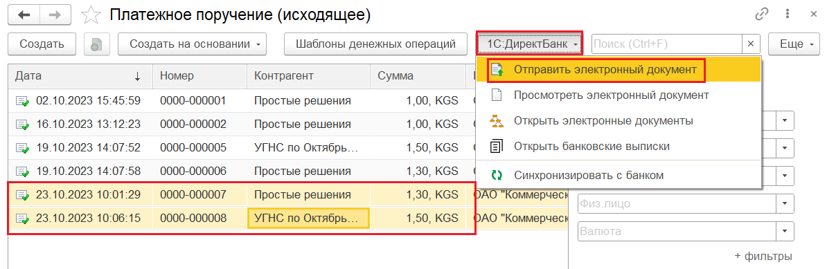 Для передачи платежных поручений в банк необходимо выделить один или несколько документов и с помощью кнопки «1С:Директ Банк» выполнить команду «Отправить электронный документ» в списке документов.