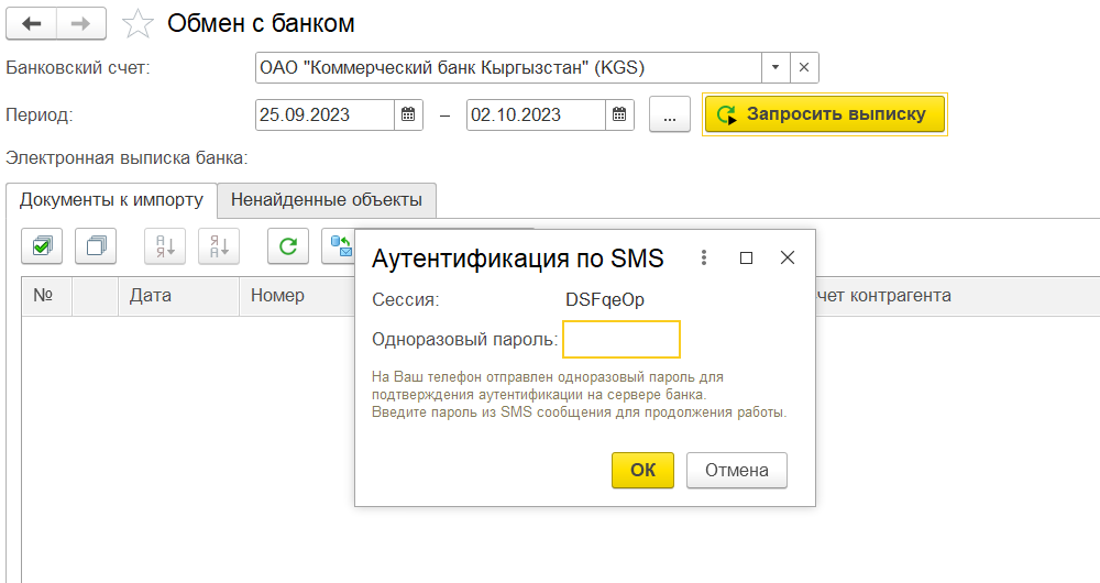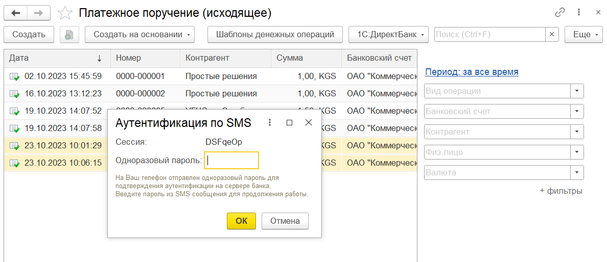 Программа дополнительно запросит одноразовый пароль, который был отправлен на мобильный телефон, указанный в банке для Вашей организации.