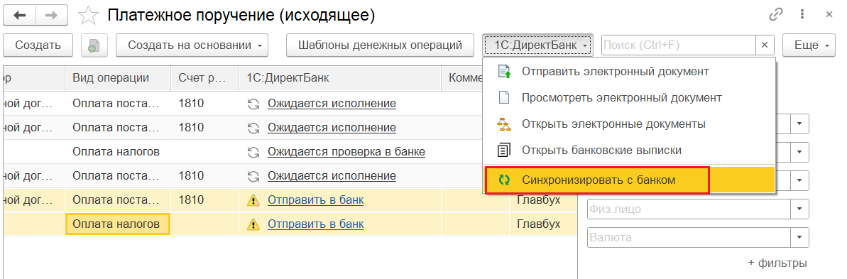 Получение информации о состоянии отправленных платежных поручений происходит при загрузке информации из банка с помощью кнопки «1С:Директ Банк» выполнить команду «Синхронизировать с банком».