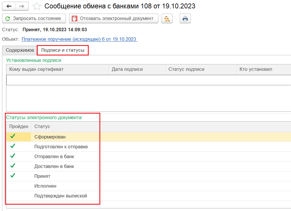 Порядок прохождения состояний для выбранного платежного документа можно увидеть в форме электронного документа на закладке Подписи и статусы.