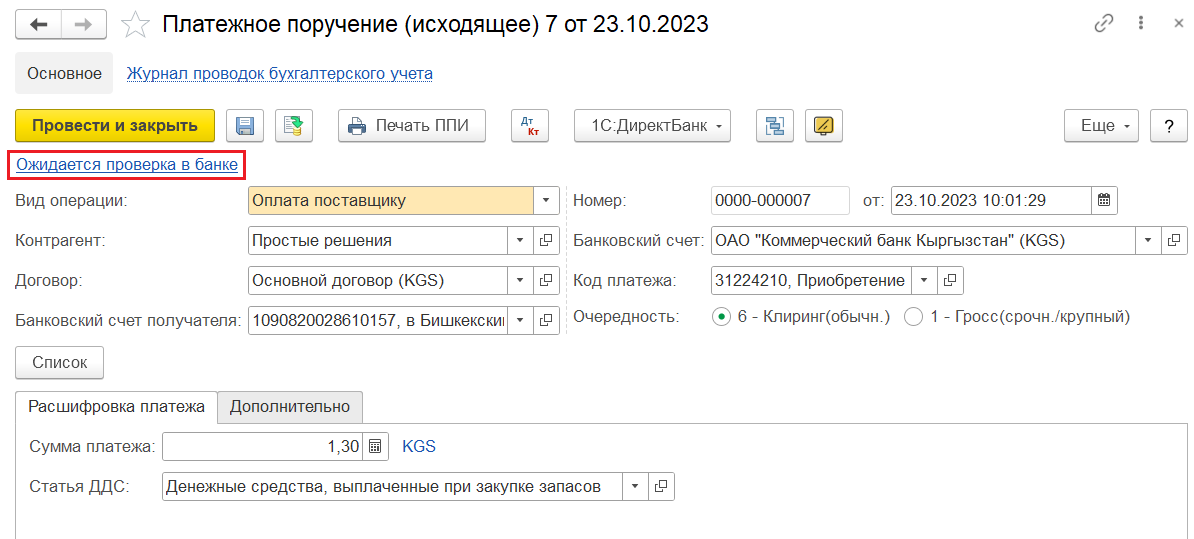 Для этого необходимо создать новое Платежное поручение исходящее или открыть ранее созданное, и провести его.