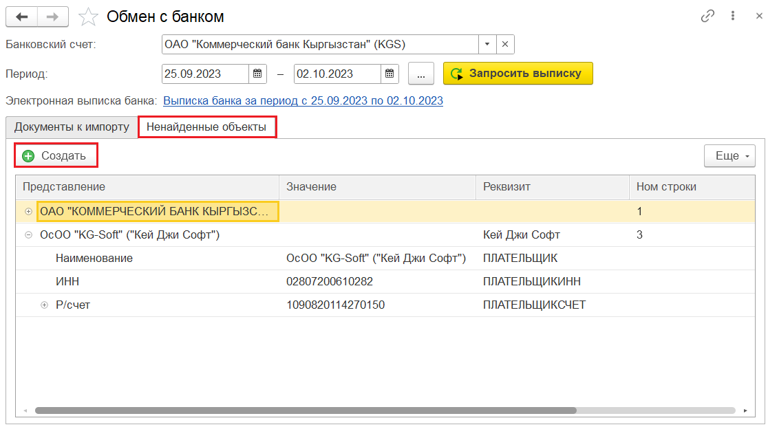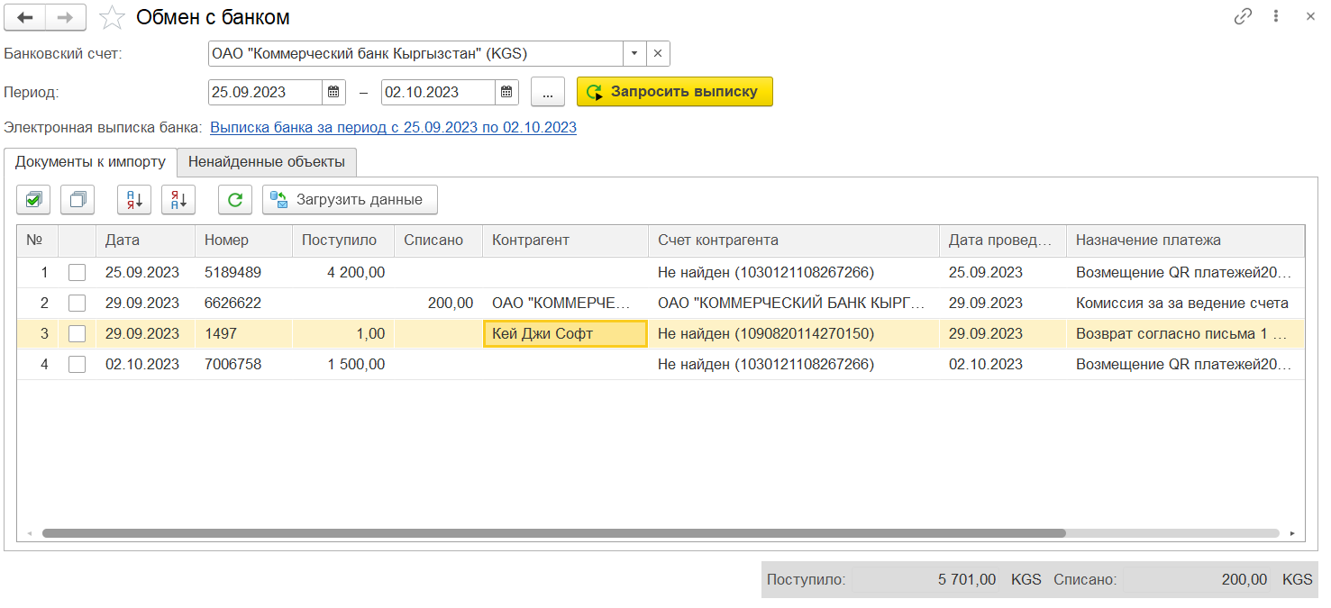 В результате выполнения команды табличная часть заполнится данными выписки банка за указанный период.