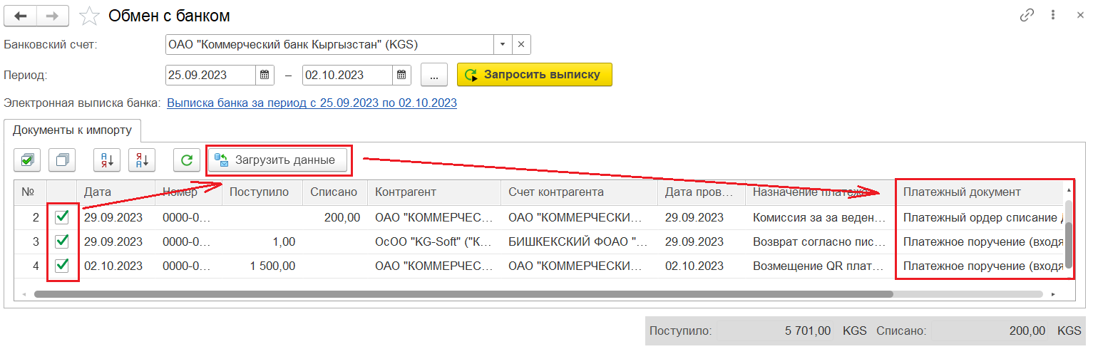 Пользователю нужно будет отметить строки и нажать Загрузить данные. После чего в колонку Платежный документ отразится наименование, номер и дата созданного документа.