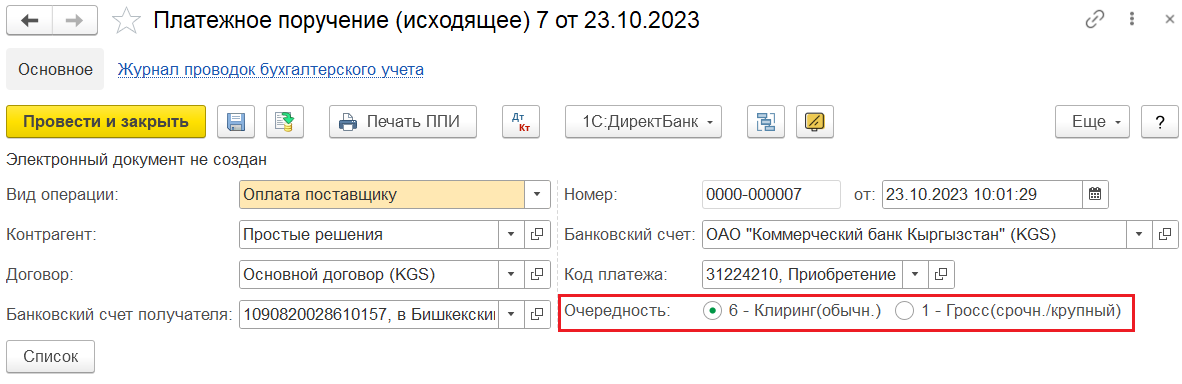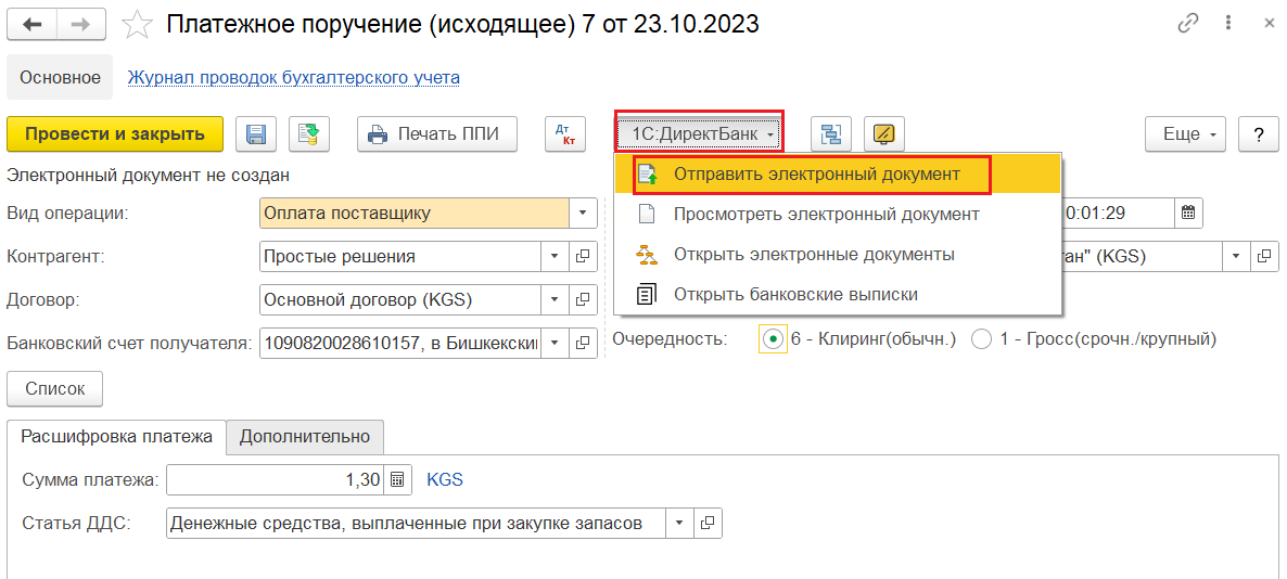 Электронный документ для передачи в банк создается на основании документа Платежное поручение с помощью кнопки «1С:Директ Банк».
